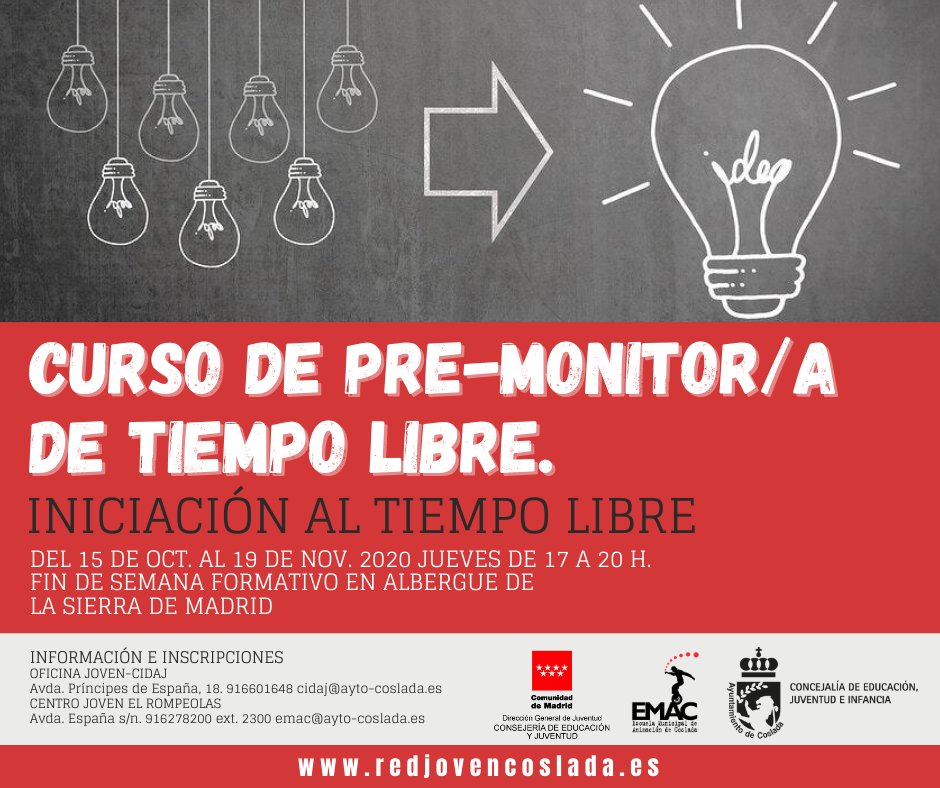 COSLADA/ 22 SEPTIEMBRE 2020/ El Área de Juventud, del Ayuntamiento de Coslada ofrece la posibilidad de realizar un curso gratuito de 36 horas de premonitor/a de tiempo libre entre el 15 de octubre y el 15 de noviembre de 2020 con fin de semana en albergue de la Sierra de Madrid los días 17 y 18 de octubre. Está dirigid a jóvenes de entre 14 y 16 años.