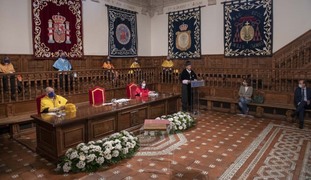 Sin la tradicional comitiva del claustro universitario que habitualmente recorre las calles el casco histórico de la ciudad, debido a la actual situación sanitaria, el acto, que ha tenido lugar en el Paraninfo, ha comenzado con la lectura de la Memoria del curso 2019-2020, a cargo de la secretaria General de la UAH.