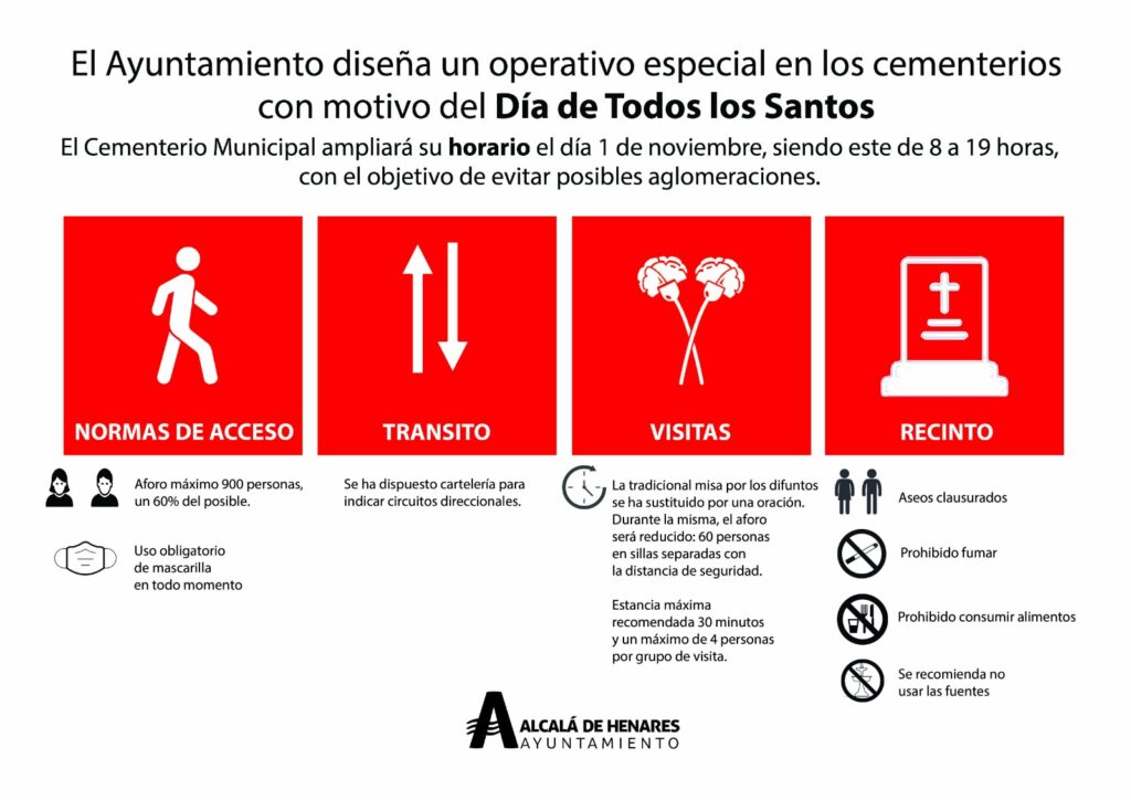 La tradicional misa por los difuntos se ha sustituido por una oración. Durante la misma, el aforo será reducido: 60 personas en sillas separadas con la distancia de seguridad. El Ayuntamiento de Alcalá de Henares recomienda una estancia máxima de 30 minutos y un máximo de 4 personas por grupo de visita.