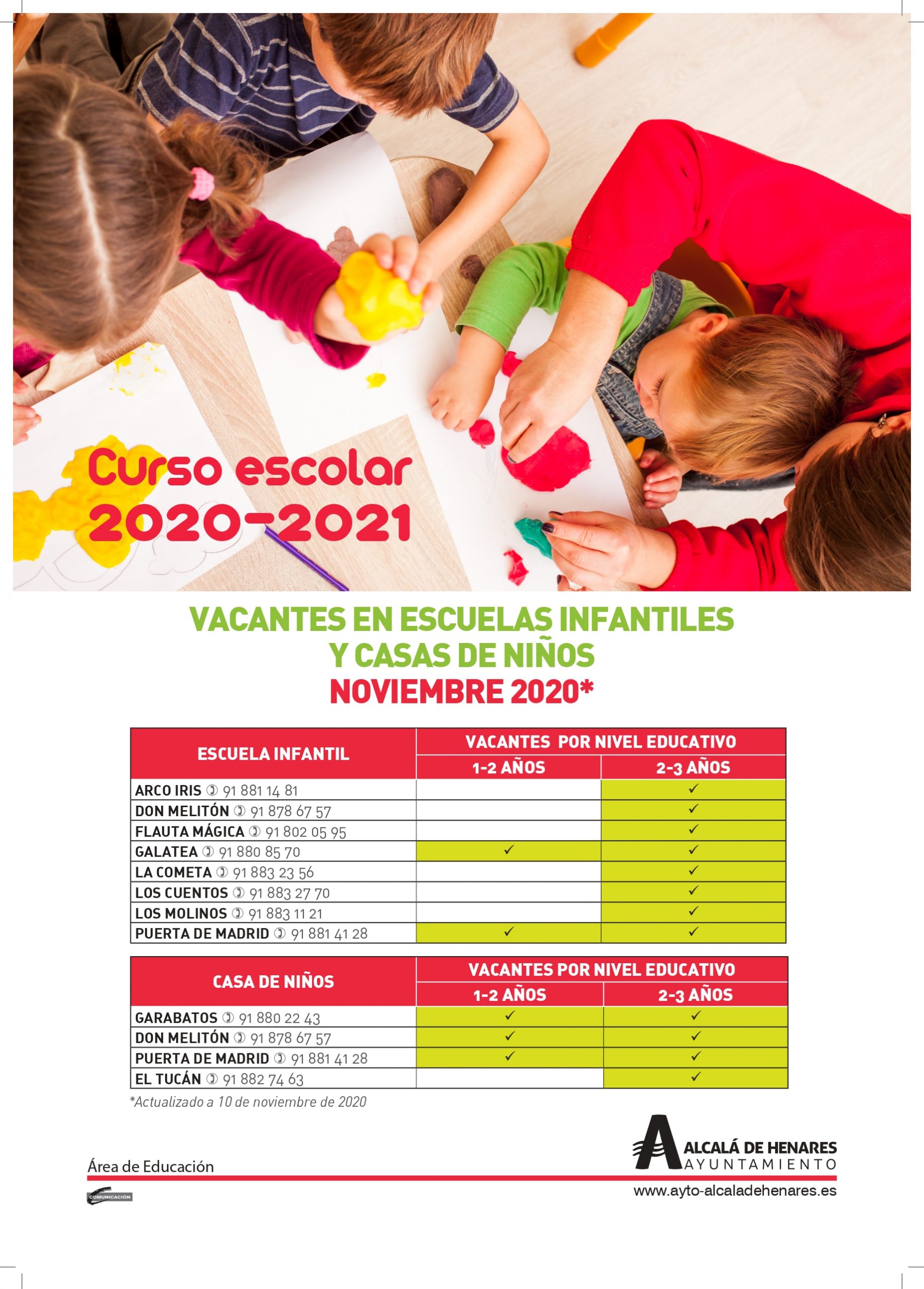 La Concejalía de Educación del Ayuntamiento de Alcalá de Henares ha informado hoy de las vacantes disponibles en las escuelas infantiles para el Curso 2020 2021.
