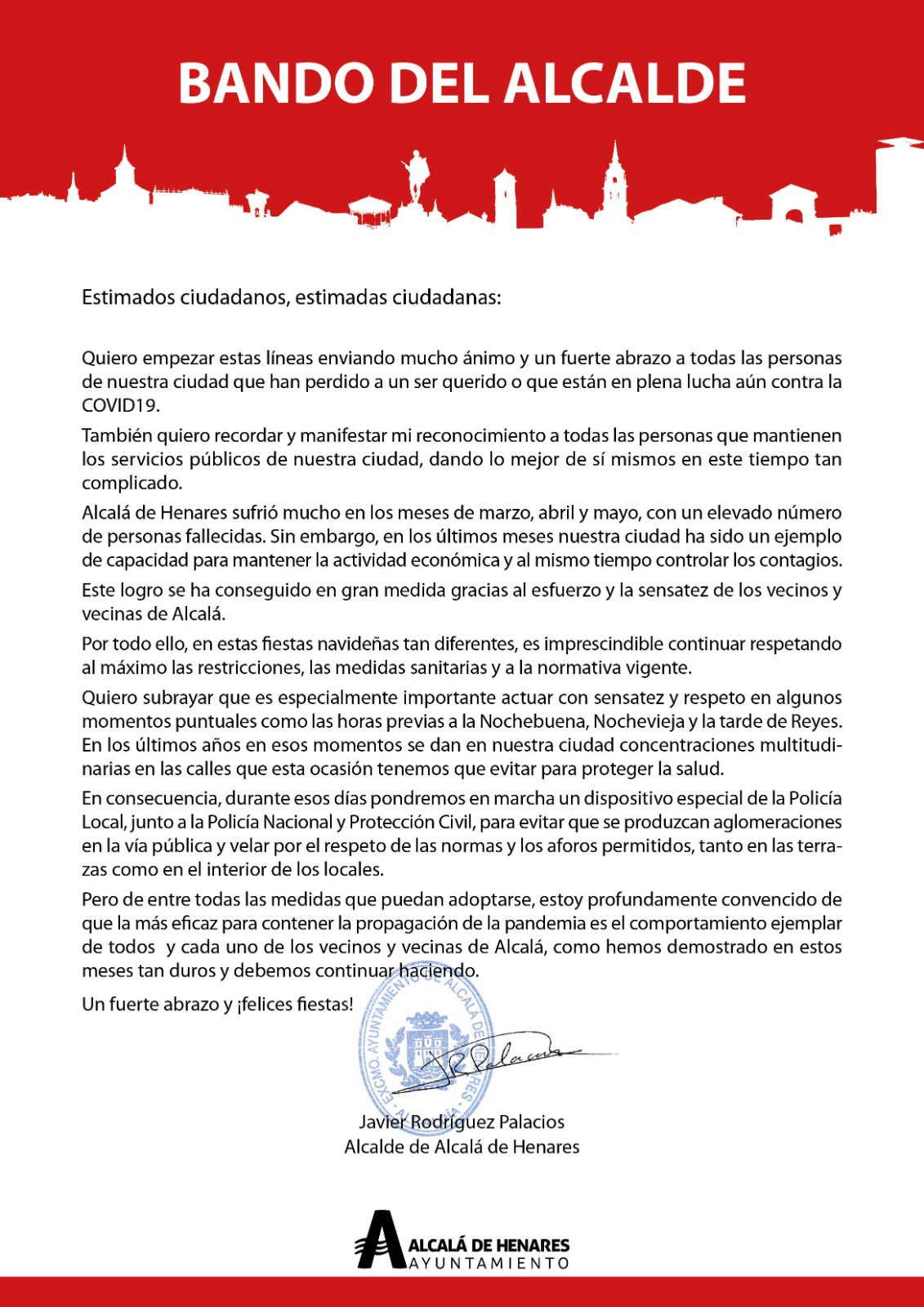 El alcalde de Alcalá de Henares, Javier Rodríguez Palacios, ha publicado hoy un bando dirigido a toda la ciudadanía en el que recuerda la necesidad de “continuar con el respeto a las restricciones, medidas sanitarias y a la normativa vigente”. El primer edil ha apelado a la “sensatez y respeto en momentos puntuales como las horas previas a la Nochebuena, Nochevieja y tarde de Reyes, momentos en que en otros años se han dado concentraciones multitudinarias que, desgraciadamente, este año tenemos que evitar”.