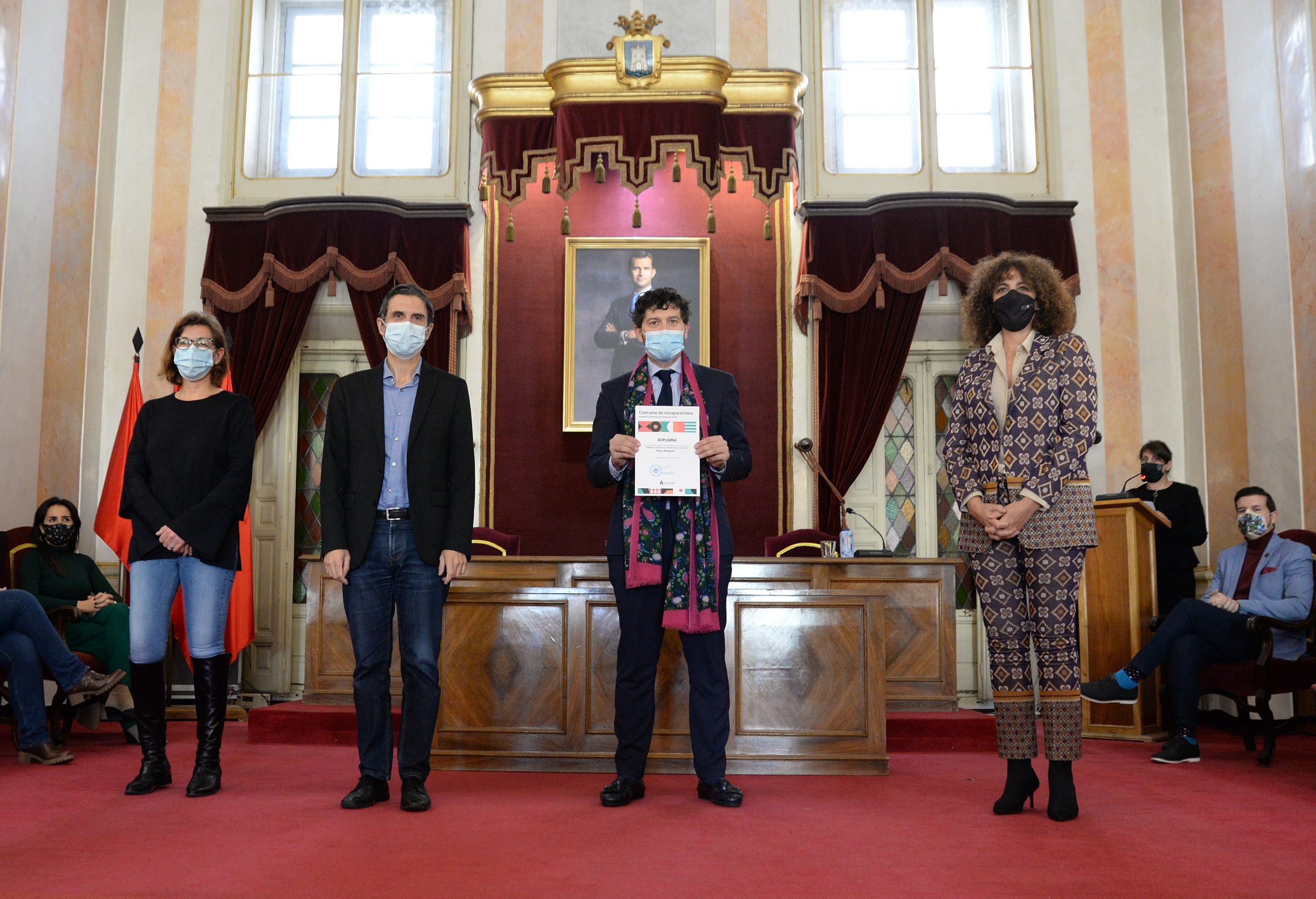 El Salón de Plenos del Ayuntamiento ha acogido esta mañana el acto de entrega de los premios de los concursos de escaparatismo y de páginas web del pequeño comercio de Alcalá de Henares, convocados por la Concejalía de Comercio para esta Navidad 2020.