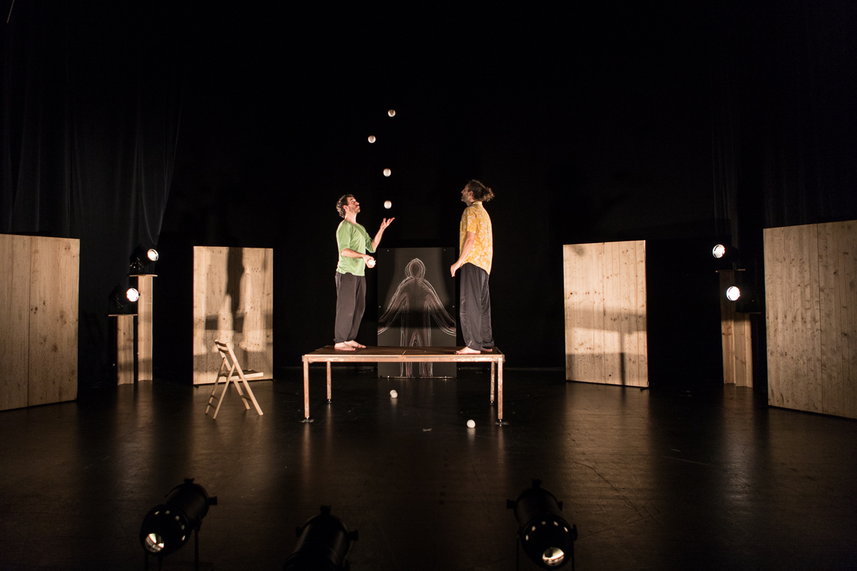 Suspensión es un espectáculo de Circo Coreográfico en creación que comenzó en 2018. Se ve en escena a cinco hombres, cuatro de ellos son intérpretes, malabaristas, manipuladores de objetos que en su movimiento hacen flotar pelotas, imantan mazas y lanzan cuchillos. Un quinto hombre se mimetiza en la mecánica lumínica, un metatécnico.