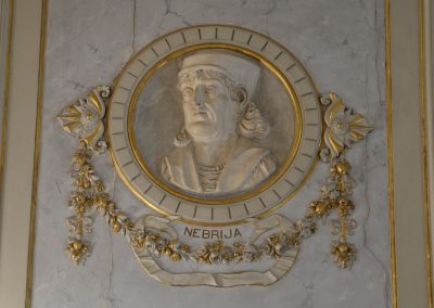Nebrija nació en Lebrija en 1444 y murió en Alcalá en 1522. Fue autor de la primera Gramática sobre la Lengua Castellana (1492) y participó en la Biblia Políglota Complutense (1514), ejemplar conservado en también en Alcalá.