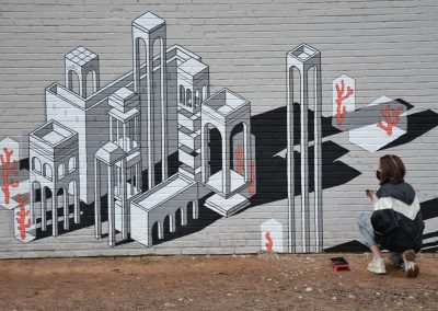 Además, la Casa de la Juventud acoge ya el tercer trabajo del proyecto MUROJUVE del Taller de Arte Urbano del FRAC, que consiste en una galería exterior dedicada a la promoción del joven arte urbano. En esta ocasión, la ilustradora y muralista Nerea Sanz (Nermelada) muestra su obra, en el que con arquitectura y surrealismo a partes iguales genera una imagen, un paisaje que nos invita a reflexionar sobre nuestro propio tiempo.