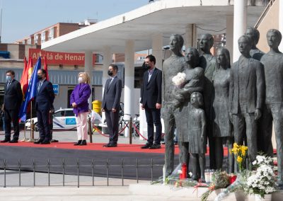 El alcalde de Alcalá de Henares, Javier Rodríguez Palacios, acompañado por los tenientes de alcalde, por los portavoces de los grupos políticos representados en el Consistorio, Partido Socialista, Ciudadanos, Partido Popular, Vox y Unidas Podemos Izquierda Unida, así como por concejales y concejalas, ha asistido esta mañana al minuto de silencio y posterior ofrenda floral con motivo del XVII Aniversario de los atentados del 11-M. Ha acudido al acto también Concepción Dancausa, viceconsejera de Vivienda de la Comunidad de Madrid.
