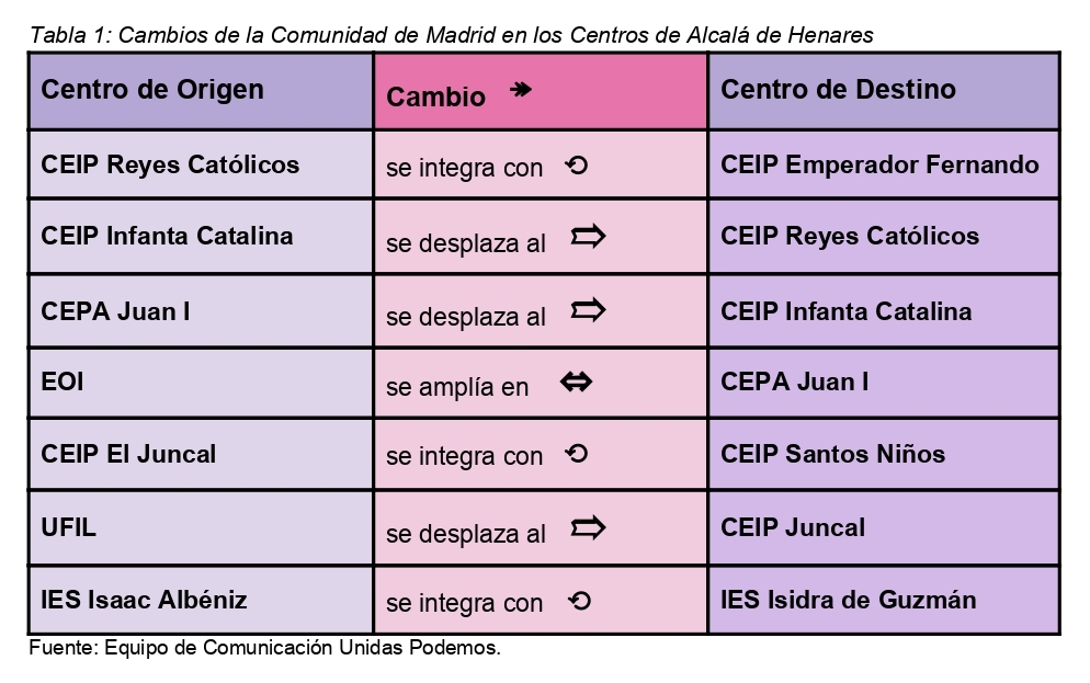 En este sentido, según Unidas Podemos IU, “la Comunidad de Madrid alega que estos cambios se deben a una mera reorganización de los espacios y medios educativos y comunicó a los Consejos Escolares que oponerse no valdría de nada”.