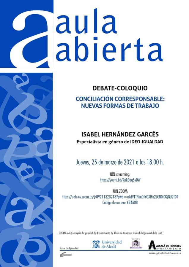 ALCALÁ DE HENARES/ 24 MARZO 2021/ La sesión de Aula Abierta del próximo jueves 25 de marzo estará dedicada a la “Conciliación responsable: nuevas formas de trabajo”, y correrá a cargo de Isabel Hernández Garcés, especialista de género de IDEO-IGUALDAD.