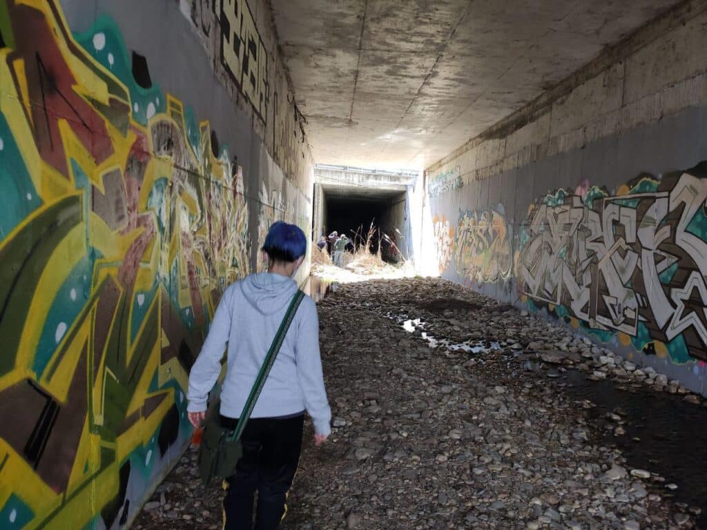Arroyo Camarmilla a su paso por Alcalá de Henares – Fotografía Podemos ADHAdemás de las situaciones antes descritas con respecto al arroyo, las vecinas explicaron que “cuando cae el sol, tanto el pipican como toda la parte del parque alejada de las viviendas quedan en absoluta oscuridad por la falta de iluminación de cualquier tipo. Para poder pasear, salir con sus compañeros animales o hacer ejercicio, entre otras actividades, deben ir con linternas para evitar accidentes, ver donde pisan o evitar los socavones que existen aún hoy“.