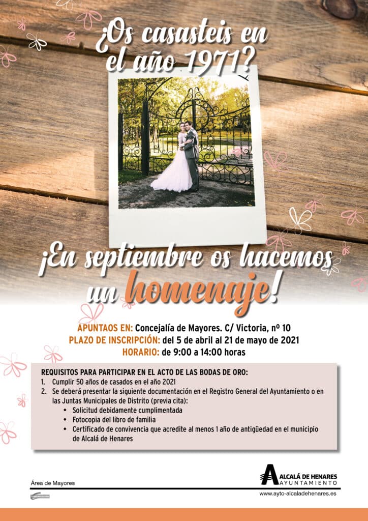 ALCALÁ DE HENARES/ 24 MARZO 2021/ La Concejalía de Mayores del Ayuntamiento de Alcalá de Henares abre el lunes 5 de abril el plazo para inscribirse en el acto de homenaje que el consistorio complutense rinde todos los años en el mes de septiembre a las parejas que celebran sus Bodas de Oro.