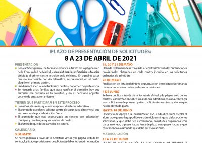 Las solicitudes se presentarán, con carácter general, de forma telemática a través de la página web de la Comunidad de Madrid (comunidad.madrid/url/admisión-educacion), dirigidas al primer centro incluido en la solicitud. En aquellos casos en los que no sea posible la presentación telemática, se presentarán físicamente en el centro elegido en primera opción.