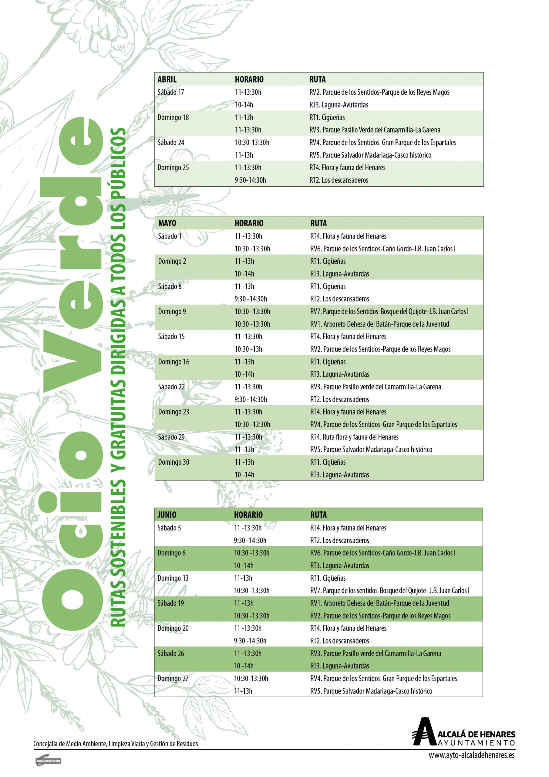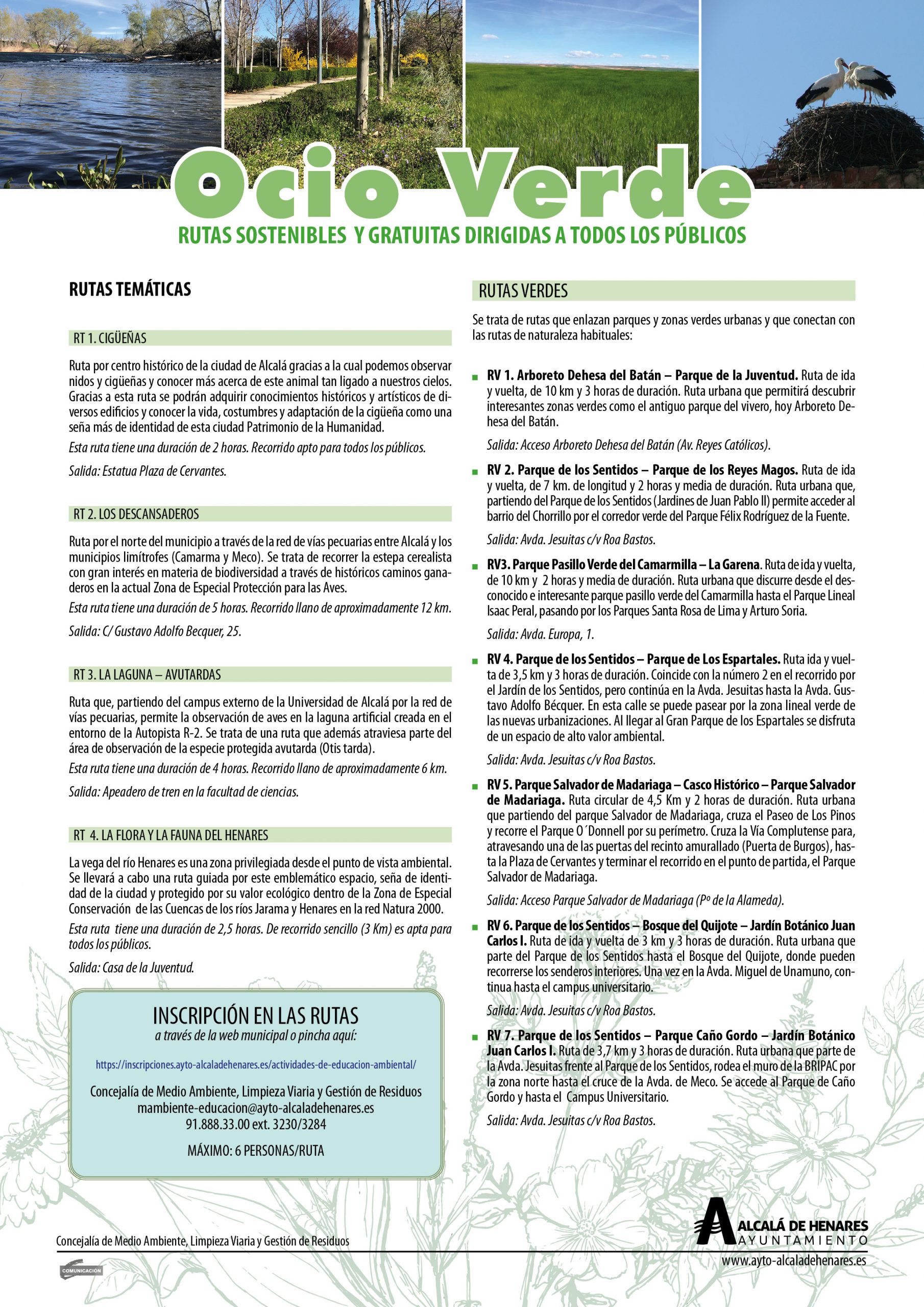 El Ayuntamiento de Alcalá de Henares ha preparado un programa de rutas sostenibles y gratuitas dirigidas a todos los públicos, en grupos reducidos, según el protocolo Covid19 establecido, y guiadas por un educador ambiental.