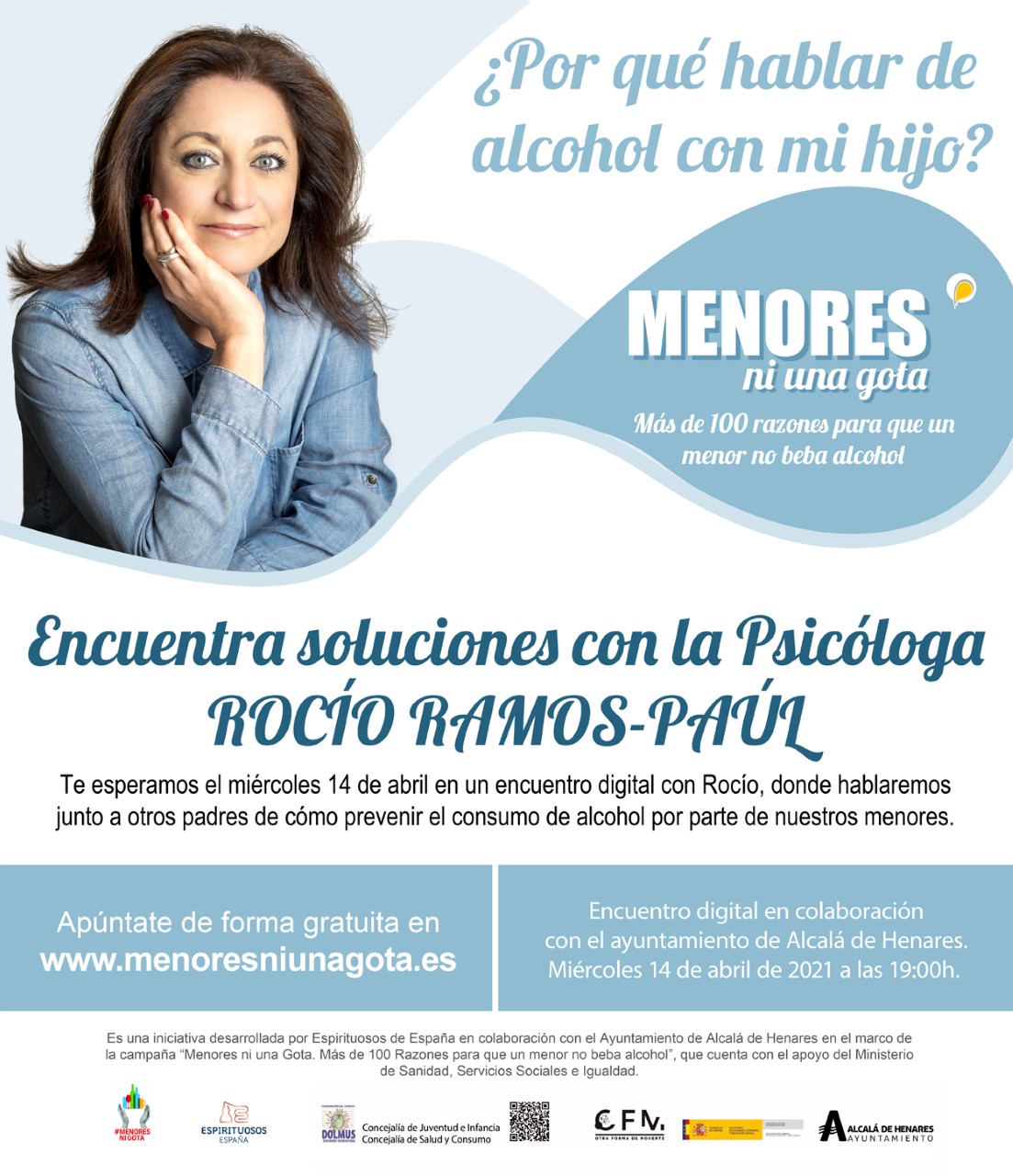 Alcalá de Henares acogerá el próximo miércoles 14 de abril, a las 19:00 horas, un encuentro online con familias de la ciudad para abordar la prevención del consumo de alcohol entre los menores a cargo de la psicóloga Rocío Ramos-Paúl, conocida por su intervención en el programa de televisión “Supernnany”. Será la segunda charla de la psicóloga en la ciudad complutense, tras el taller que impartió en 2019 a un total de 100 familias.