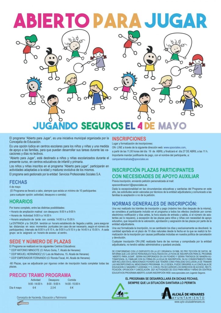 ALCALÁ DE HENARES/ 16 ABRIL 2021/ La Concejalía de Educación de Alcalá de Henares pondrá en marcha el programa “Abierto para jugar” el próximo 4 de mayo, día de las elecciones a la Asamblea de Madrid, motivo por el que será jornada no lectiva en los centros educativos no universitarios de la Comunidad de Madrid.