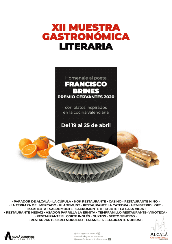 ALCALÁ DE HENARES/ 20 ABRIL 2021/ Durante toda esta semana y hasta el próximo 25 de abril, los restaurantes que forman parte de la Asociación Alcalá Gastronómica  Fomentur de la ciudad complutense ofrecerán platos y menús especiales inspirados en la cocina valenciana, tierra natal del poeta reconocido con el Premio Cervantes 2020, Francisco Brines.