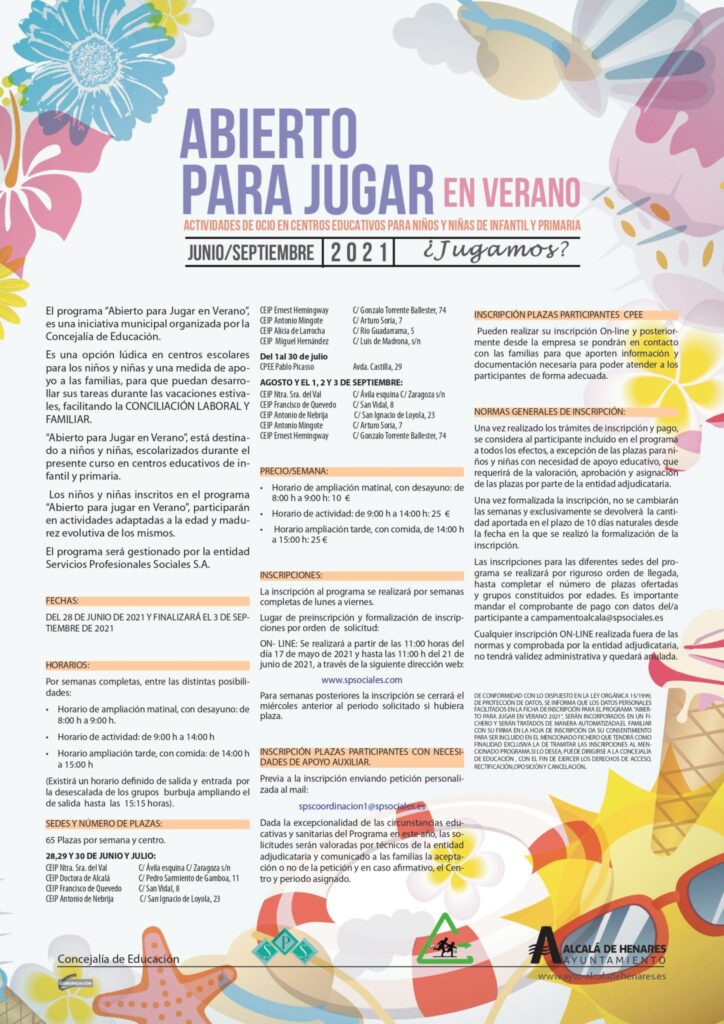 ALCALÁ DE HENARES/ 17 MAYO 2021/ La Concejalía de Educación de Alcalá de Henares vuelve a poner en marcha, un año más, el programa “Abierto para Jugar en Verano”, una iniciativa municipal que pretende servir de apoyo a las familias de escolares de centros educativos de Infantil y Primaria, para que puedan desarrollar sus tareas durante las vacaciones estivales.
