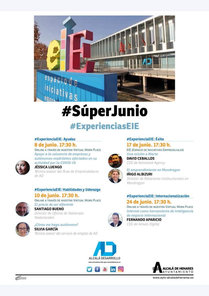 Este #SúperJunio consta de cuatro #ExperienciasEIE diferentes, con la posibilidad de inscribirse a una o más experiencias ya que son independientes entre sí. Se impartirán y desarrollarán en la plataforma virtual ‘Virtual Work Place’ de Alcalá Desarrollo.