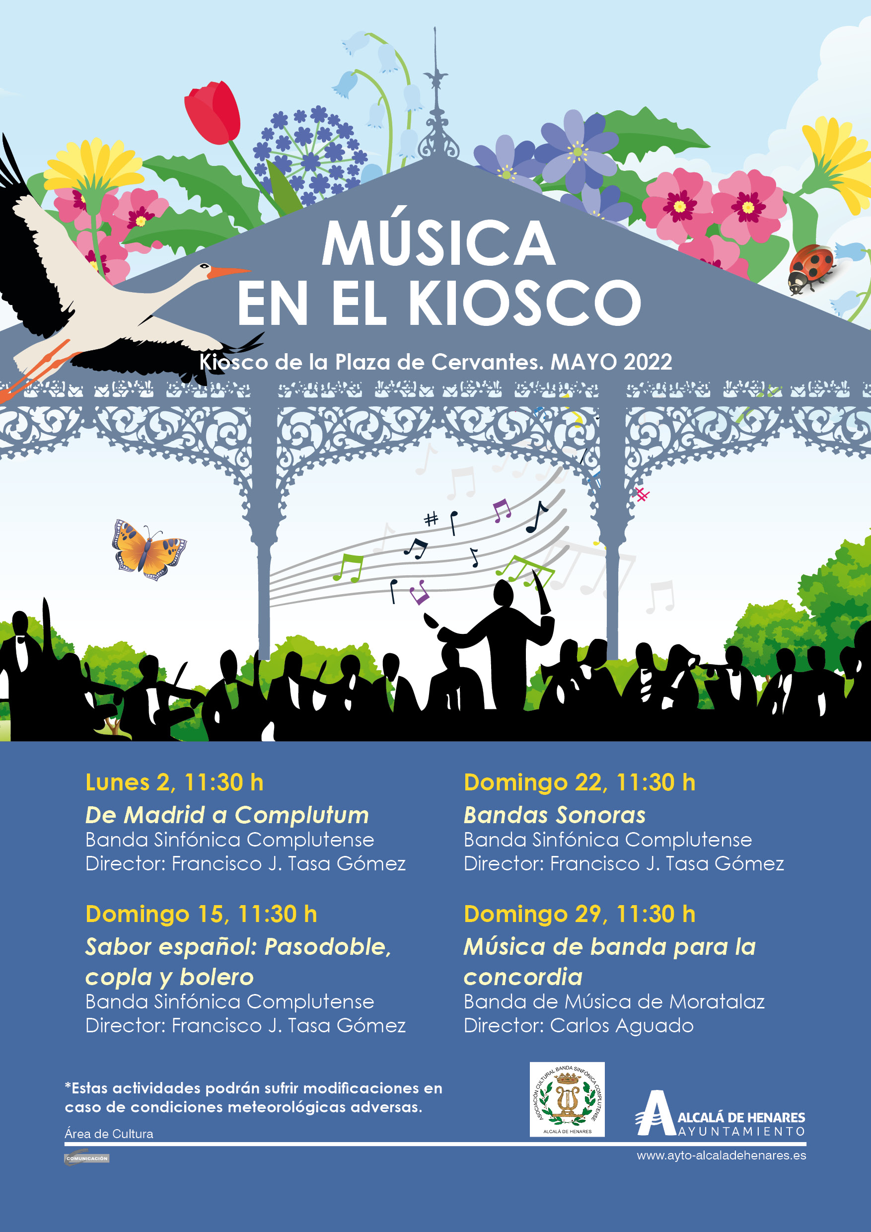 El Kiosco de la Música de la Plaza de Cervantes volverá a ser escenario durante el mes de mayo del ciclo “Música en el Kiosco”, con la Banda Sinfónica Complutense y la Banda de Música de Moratalaz como protagonistas. La primera cita tendrá lugar el lunes 2 de mayo, y la última, el domingo 29 de mayo. Todas ellas serán a las 11:30 horas.