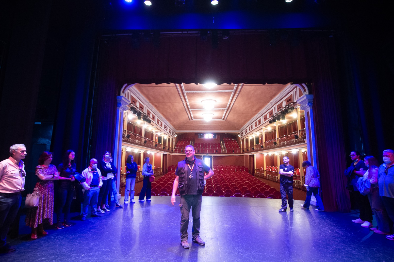 Hoy han tenido lugar las últimas visitas de las Jornadas de Puertas Abiertas del Teatro Salón Cervantes, organizadas como colofón a la programación del Festival de la Palabra 2022 en Alcalá de Henares, y por las que los visitantes han podido conocer espacios como el escenario, los almacenes, los camerinos, la cabina técnica, así como el funcionamiento de tramoya, los telones, los focos, el sonido, su historia y algunos recovecos curiosos.