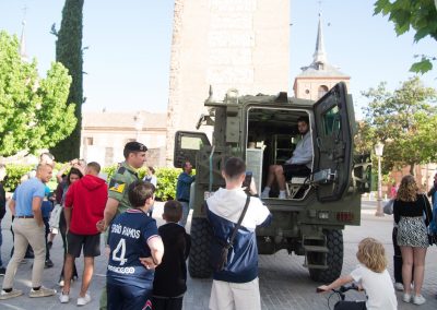 La jornada, que se ha organizado con la colaboración del Ayuntamiento de Alcalá de Henares, ha comenzado con una exposición de material en la Plaza de Cervantes que se ha podido visitar de 18:00 a 21:00 horas y que ha estado compuesta por vehículos desplegados en dicha Zona de Operaciones bajo el mandato de la OTAN: LMV con LAG-40 y RG-31 con una AMP 12,70 mm, material de tiradores de precisión y medios UAV, Material EOD (desactivadores de explosivos), diversas fotografías de las misiones llevadas a cabo, así como material diverso, tanto de la población local como de la coalición internacional.