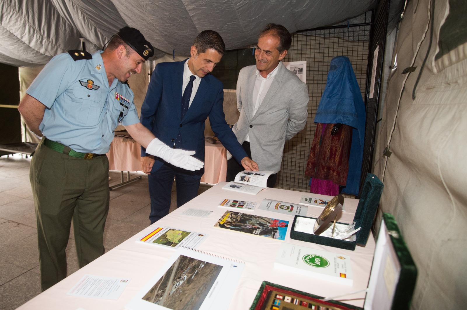 La jornada, que se ha organizado con la colaboración del Ayuntamiento de Alcalá de Henares, ha comenzado con una exposición de material en la Plaza de Cervantes que se ha podido visitar de 18:00 a 21:00 horas y que ha estado compuesta por vehículos desplegados en dicha Zona de Operaciones bajo el mandato de la OTAN: LMV con LAG-40 y RG-31 con una AMP 12,70 mm, material de tiradores de precisión y medios UAV, Material EOD (desactivadores de explosivos), diversas fotografías de las misiones llevadas a cabo, así como material diverso, tanto de la población local como de la coalición internacional.
