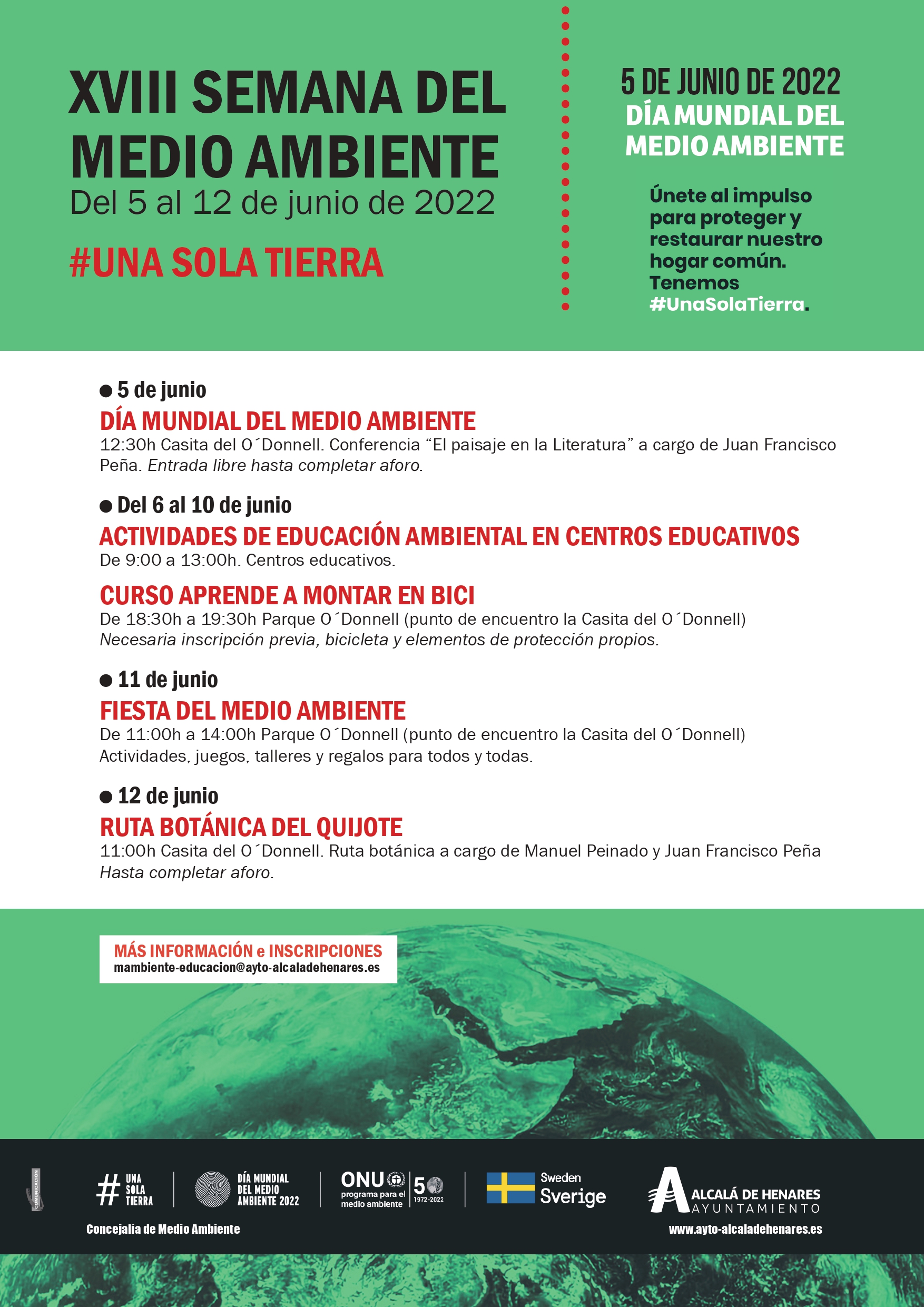 Un año más, con motivo de la celebración del Día Mundial del Medio Ambiente el 5 de junio, Alcalá de Henares celebra la XVIII Semana del Medio Ambiente del 5 al 12 de junio, haciendo suyo el lema elegido por las Naciones Unidas “Una sola Tierra”, el mismo que hace 50 años fue elegido en la Conferencia de Naciones Unidas de 1972 y que, a día de hoy, sigue vigente: este planeta es nuestro único hogar y es responsabilidad de la humanidad salvaguardar sus recursos finitos.