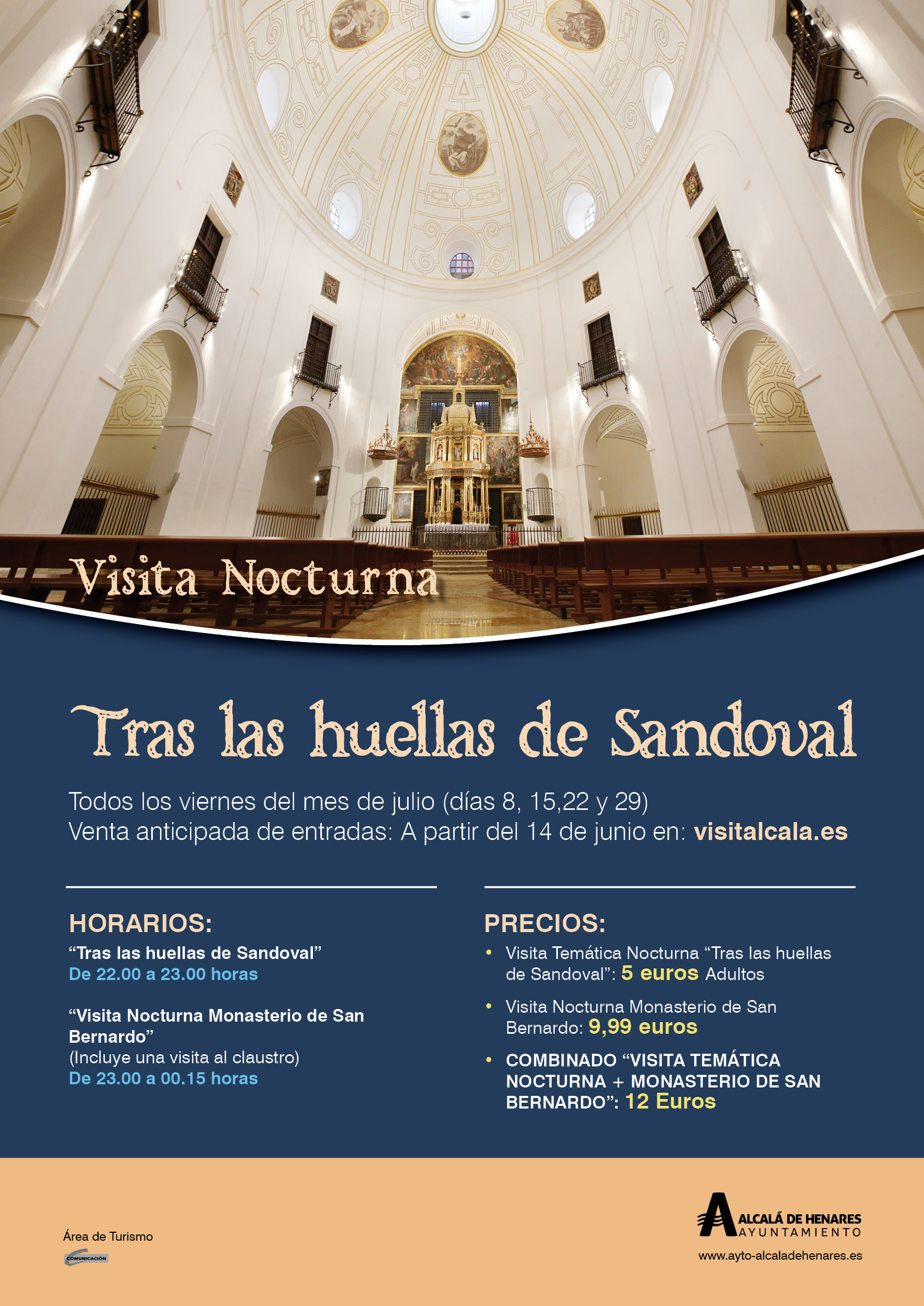 La Concejalía de Turismo de Alcalá de Henares ha puesto en marcha una nueva visita temática nocturna, “Tras las huellas de Sandoval”, que tendrán lugar todos los viernes de mes de julio. La visita podrá combinarse con la Visita Nocturna al Monasterio de San Bernardo.