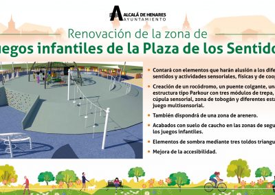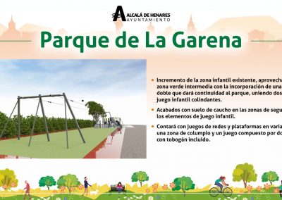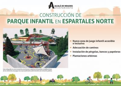 Alcalá de Henares contará con cuatro nuevas áreas infantiles dotadas con juegos de integración para favorecer el acceso a este tipo de instalaciones a todos los niños y niñas de la ciudad, sin importar sus diferentes capacidades. Las cuatro áreas infantiles se ubicarán en los barrios de Espartales Norte, el Chorrillo, La Garena y el Ensanche, y contarán con una inversión de 1,5 millones de euros provenientes de las arcas municipales e incluidos en el Presupuesto Municipal.