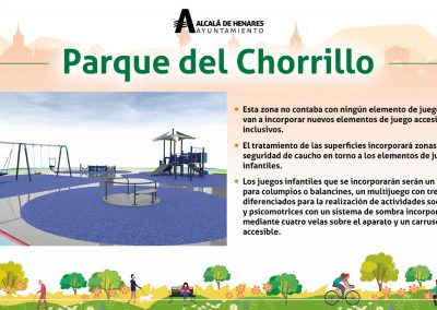 El espacio central del Parque del Chorrillo contará en los próximos meses con una nueva zona infantil con elementos de juego de integración, que garantizará el acceso de todos los niños y niñas con diversidad funcional. Un nuevo parque infantil que contará con un pórtico para columpios y balancines, un multijuego con tres espacios diferenciados para la realización de actividades sociales y psicomotrices, un carrusel accesible y un panel de juego sensorial.