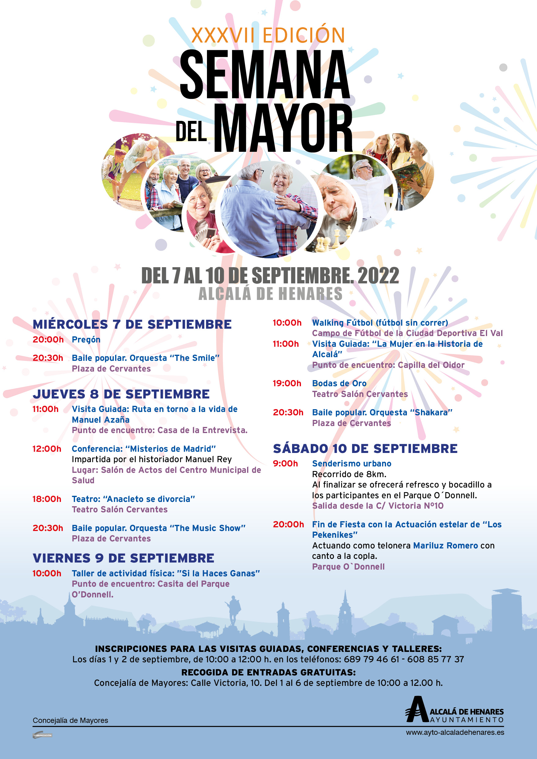 La Concejalía de Mayores de Alcalá de Henares ha organizado, como ya es tradicional en la ciudad, su XXXVII Semana del Mayor durante los primeros días de septiembre. Del 7 al 10 de septiembre, los mayores alcalaínos podrán disfrutar de una programación diseñada para ellos, donde no faltarán los bailes, visitas guiadas, actividades físicas o el acto de homenaje a las parejas que celebran este año sus Bodas de Oro.