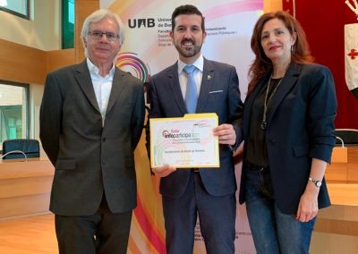 El concejal de Transparencia, Innovación Tecnológica y Gobierno Abierto, Miguel Castillejo Calvo, recoge el sello de manos del Catedrático de Comunicación Audiovisual y Publicidad de la UAB, Armand Balsebre Torroja.