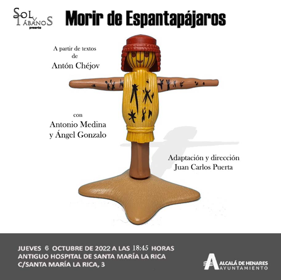 El próximo jueves, 6 de octubre a las 18:45 horas en el Antiguo Hospital de Santa María La Rica, la Compañía “Sol y Tábanos” presenta su espectáculo “Morir de Espantapájaros”, una lectura dramatizada a partir de textos de Antón Chéjov, con Antonio Medina y Ángel Gonzalo, con la adaptación y dirección de Juan Carlos Puerta.
