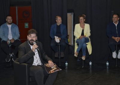 A la presentación de ALCINE51 en el Teatro Salón Cervantes han el director general de Promoción Cultural, Gonzalo Cabrera; la concejal de Cultura, María Aranguren; el coordinador del Festival, Luis Mariano González; el director artístico de ALCINE, Pedro Toro; el director Dan Barreri, que presentará en ALCINE51 el primer documental sobre el colectivo de arte urbano Boa Mistura; y los creadores de la imagen de ALCINE51, Luis León y Jabi Medina, de Equipo SOPA.