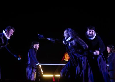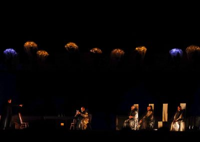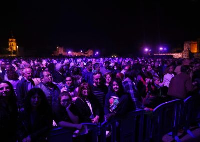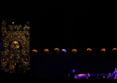 Los siete actos se desarrollaron en cinco escenarios diferentes, que inducían la itinerancia del numeroso público asistente. La escenografía estuvo protagonizada por un mapping proyectado sobre la muralla y sus torres, una propuesta novedosa y muy apropiada para un espacio tan amplio como la Huerta del Obispo con un aforo cercano a las 12.000 personas.