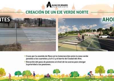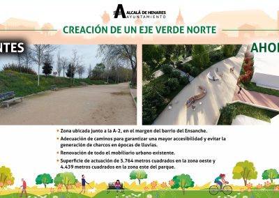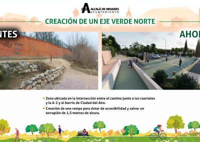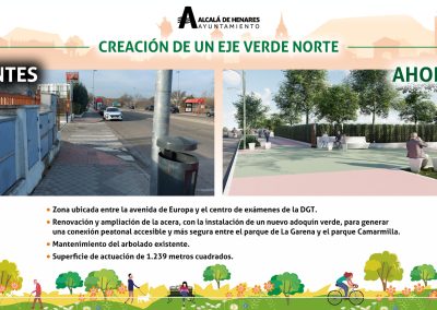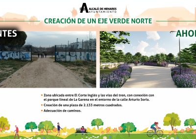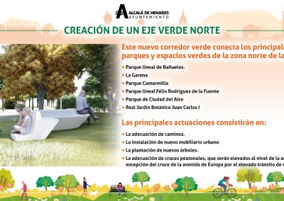 El Ayuntamiento de Alcalá de Henares creará un nuevo Eje Verde Norte que generará un relato continuo desde la zona este de la ciudad, en el entorno del barrio de Ciudad del Aire y el Real Jardín Botánico, con la zona oeste, en el entorno de La Garena y el parque Bañuelos. El proyecto cuenta con una inversión de 1.469.896,88 euros municipales, un plazo de ejecución de 4 meses y contempla la creación de un recorrido peatonal verde de 10 kilómetros de extensión, de los cuales un 90% corresponden a caminos integrados en zonas verdes y un 10% a conexiones urbanas.