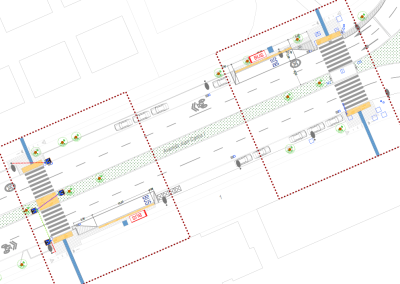 • Desplazamiento y reestructuración de las paradas de autobús: a lo largo de la Avenida se encuentran 2 paradas de autobús, una por cada sentido de circulación que se reubicarán para situarse pasado el paso de peatones con objeto de facilitar la movilidad y la seguridad por visibilidad en los pasos de peatones.