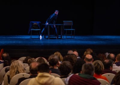 La pieza giraba en torno al “Centro Di Gravità Permanente” de Franco Battiato, consiguiendo, a través del juego, cambiar el eje al espectador, su centro de gravedad, con sorpresas fruto de la improvisación, sin artificios, donde la sola presencia de los dos intérpretes logra transmitir las ganas de nutrirse con la presencia del otro y de aprovechar su potencial.