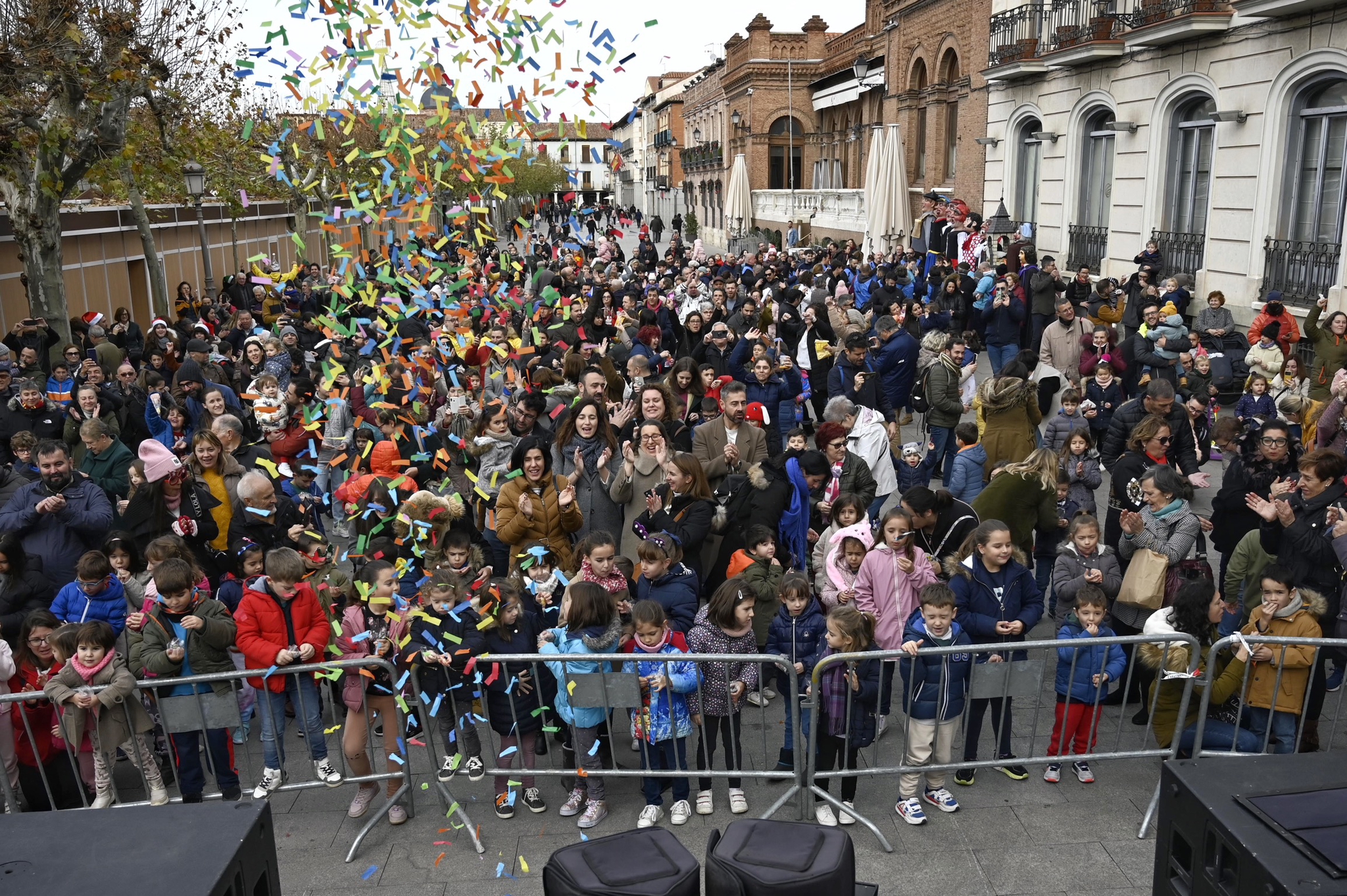 La toma anticipada de las uvas ha estado precedida de animación infantil, protagonizada por la nueva Comparsa de Gigantillos, un pasacalles infantil y el reparto de chuches, por parte de las peñas de Alcalá.