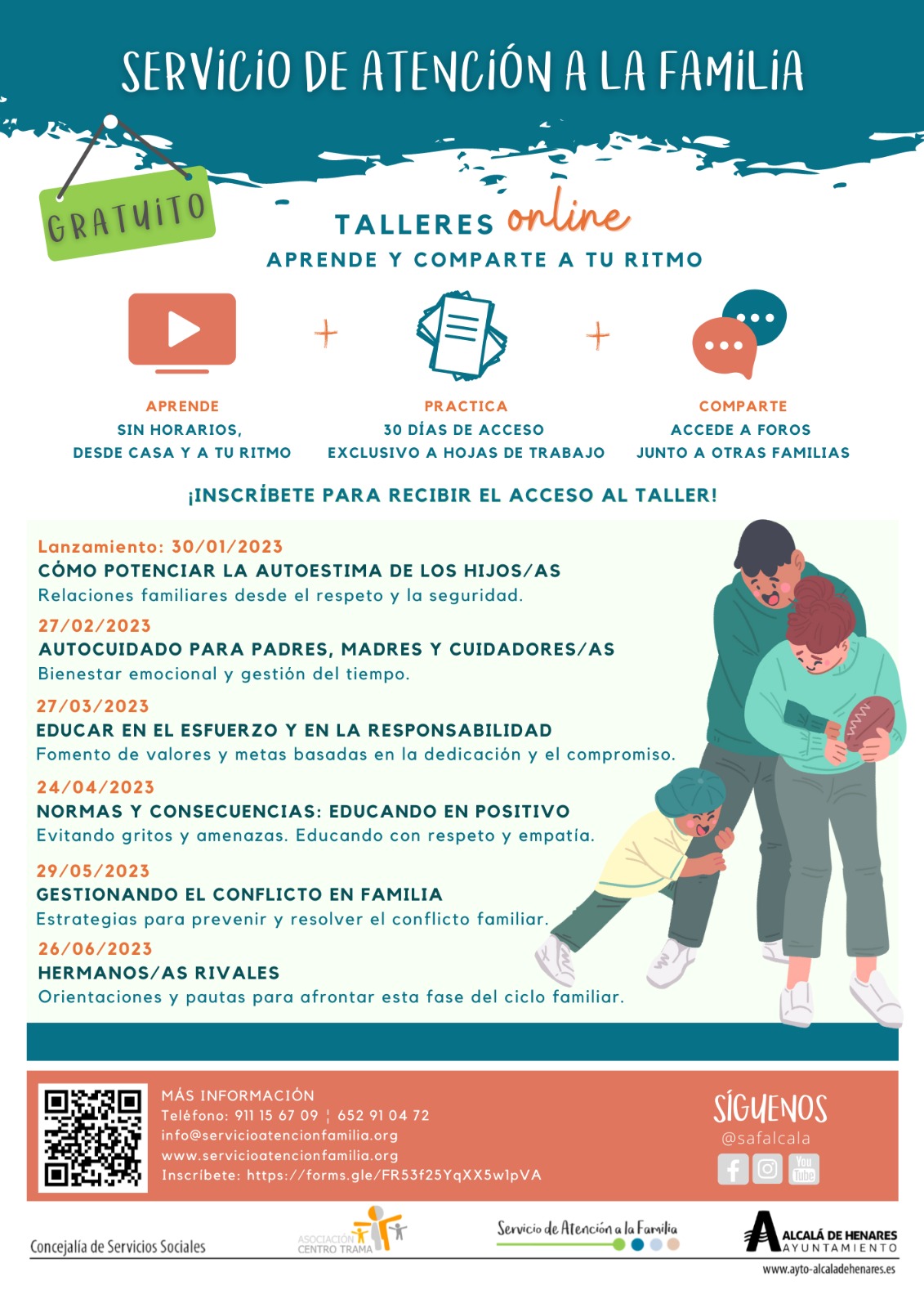 El Servicio de Atención a las Familias, dependiente de la Concejalía de Servicios Sociales del Ayuntamiento de Alcalá de Henares, ha abierto el plazo de inscripción a los nuevos talleres online “Aprende y comparte a tu ritmo”. Se trata de una formación en la que los participantes podrán compartir sus experiencias con otras familias a través de los foros establecidos en las formaciones, además de disponer de un contacto directo con un profesional de referencia para solventar todas las dudas que puedan surgir a lo largo de los talleres.