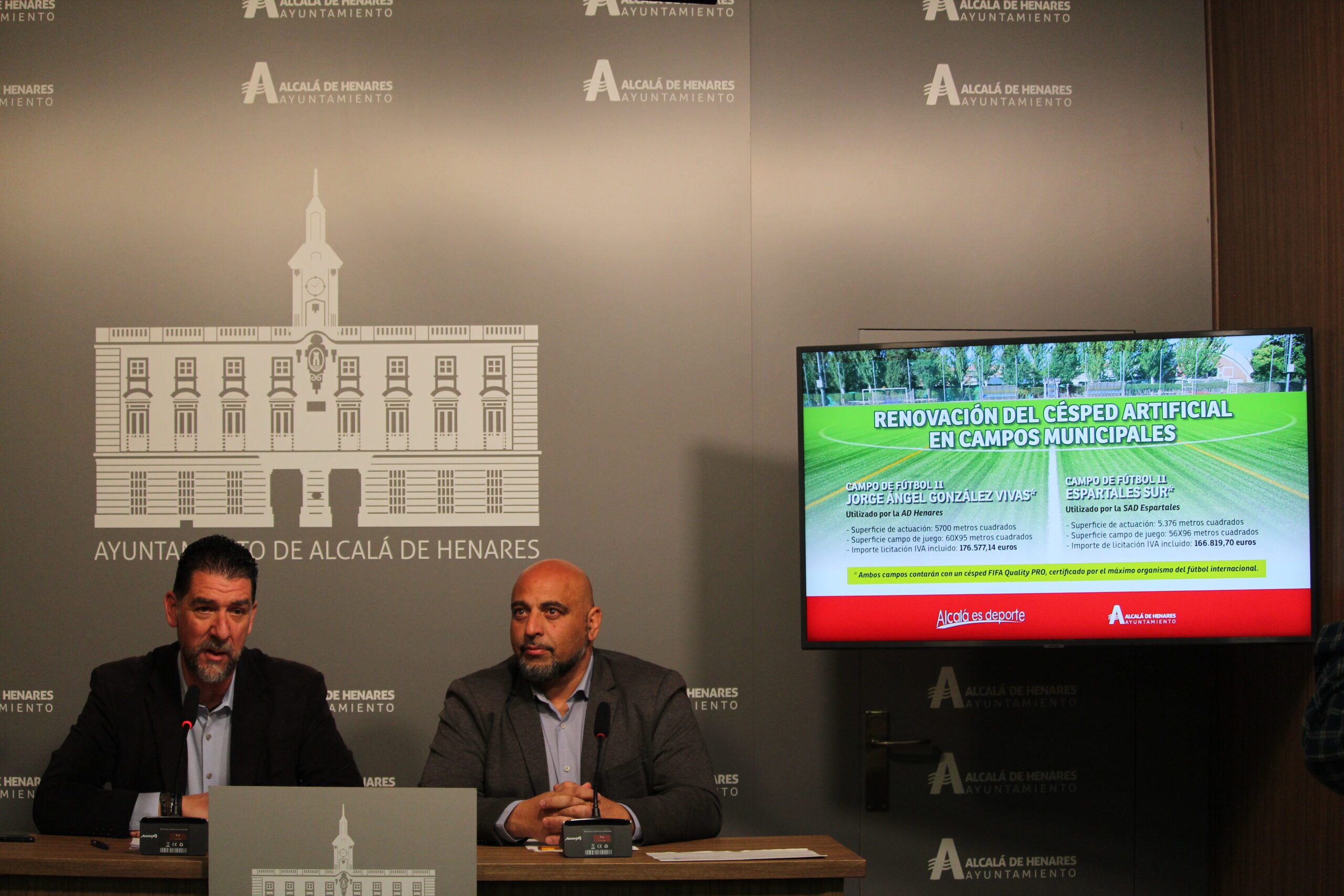 El segundo teniente de alcalde, Alberto Blázquez, y el edil de Deportes, Julián Cubilla, han presentado en la mañana de hoy nuevas inversiones en instalaciones deportivas de la ciudad. Se trata de la renovación del césped artificial de los campos de fútbol-11 Jorge Ángel González Vivas, utilizado por la AD Henares, y el Espartales, utilizado por la SAD Espartales, además de la renovación de dos nuevas pistas de barrio en las calles Río Torcón y Gran Canal, ubicadas en los barrios de Nueva Alcalá y Venecia, respectivamente. Además, el proyecto de renovación de los campos de césped culminará con la sustitución de los campos de fútbol 7 del Ensanche y el Recinto Ferial, este último utilizado por la AD Complutense, y el campo 2 de fútbol 11 del Felipe de Lucas, utilizado por el CD Avance.