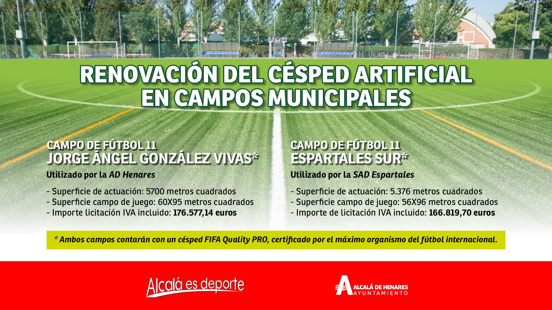Los campos de fútbol 11 Jorge Ángel González Vivas y Espartales Sur dispondrán de un nuevo césped FIFA Quality PRO, de la máxima calidad y certificado por el mayor organismo del fútbol internacional. Una renovación que tendrá lugar en los meses de verano de 2023, y que se sumarán a la ya realizada en los campos municipales de las Ciudades Deportivas Municipales del Val y el Juncal, el Felipe de Lucas, Isidro Cediel, Recinto Ferial y Luisón Abad.