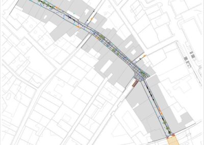 • El tramo central de la calle Talamanca será completamente peatonal, manteniendo exclusivamente el paso a vehículos de emergencia. En esta zona será dónde se concentrarán las zonas estanciales.