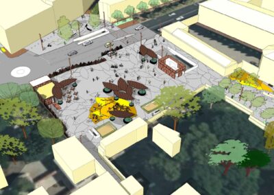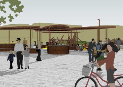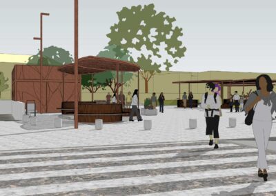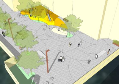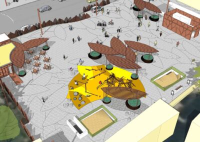 Por ello, se va a acometer este proyecto donde se toma el diseño del pavimento como base para encajar la geometría de los nuevos elementos propuestos, formando un dibujo de hojas muy visible, que se configura como el elemento más característico de este espacio. A partir de la hoja, se diseñan y encajan los elementos de sombra y los nuevos pavimentos de las zonas de juego.