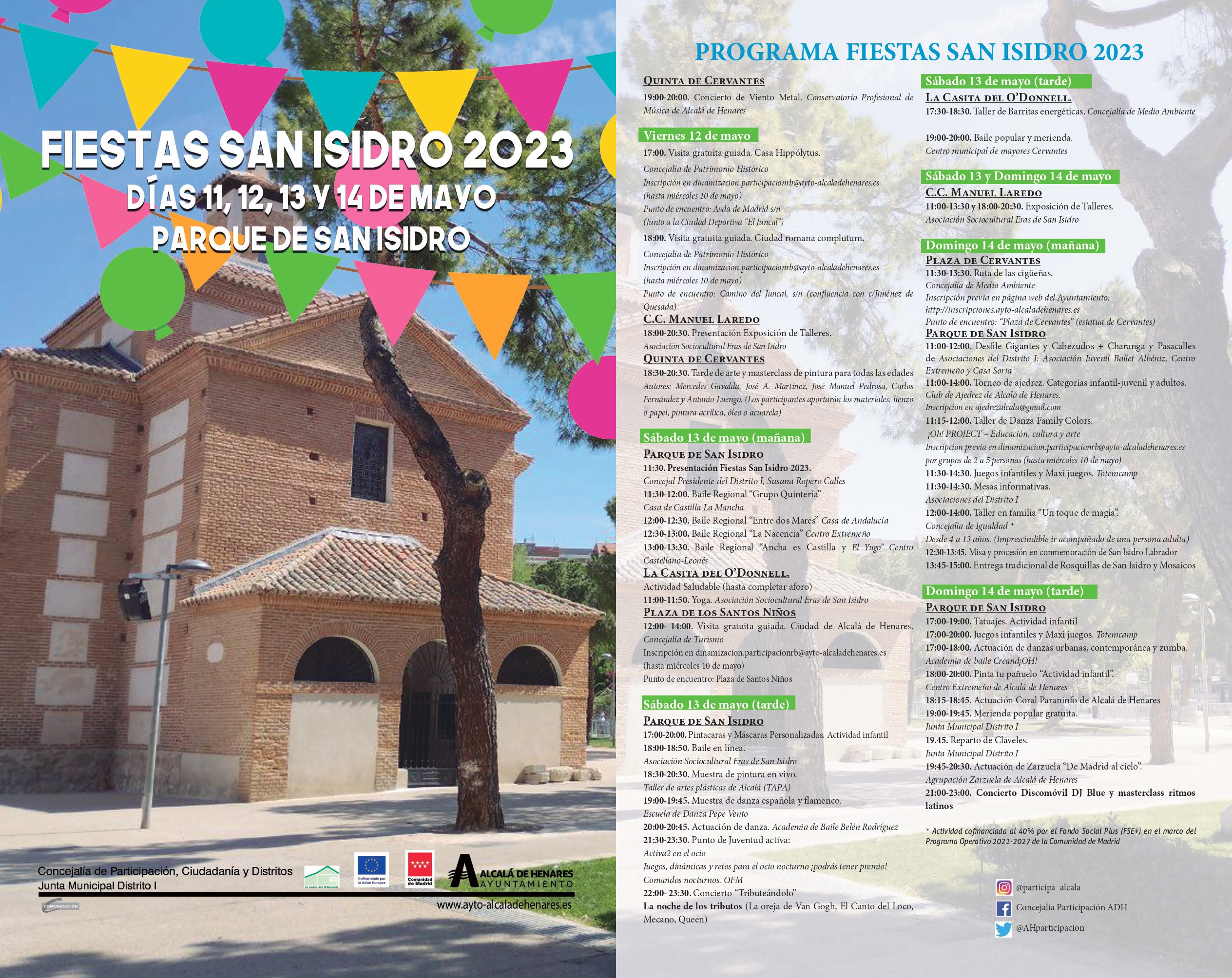 El programa de estas fiestas de San Isidro se ha preparado con mucha ilusión, con dos importantes novedades como son las actuaciones de la Agrupación de Zarzuela “De Madrid al Cielo” y de la Coral Paraninfo de Alcalá de Henares y, además, ofrecemos desde propuestas biosaludables como clases de yoga, hasta talleres, visitas guiadas y mucha música, de todos los estilos, para todos los públicos.