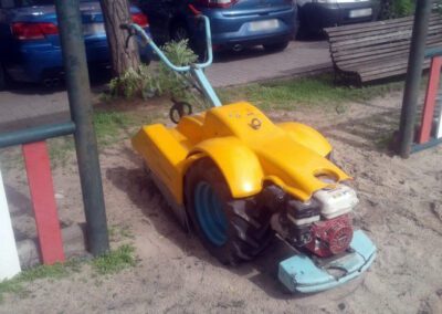Se trata de una máquina especial para la limpieza de la arena en áreas cuyo suelo de amortiguación de impactos sea la arena suelta, no compactada, con excelente resultado para granulometrías finas tipo arena de playa. Es una máquina autopropulsada, con ruedas y con mandos para guiado manual, de fácil maniobrabilidad y que cuenta con criba y tolva de recogida para eliminar los residuos de la arena (restos de cigarros, cristales, plásticos, hojas, ramitas, etc.), y profundizando además en la arena con objeto de favorecer la aireación.