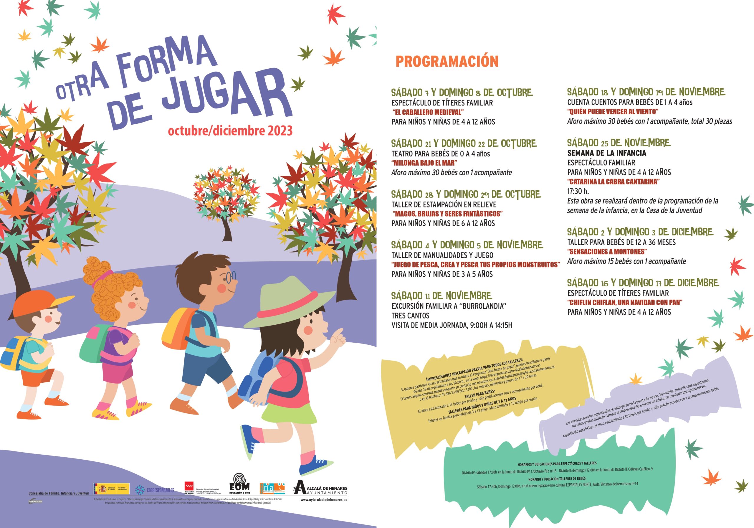 De octubre a diciembre arranca una nueva edición del programa de Otra Forma de Jugar. La programación dirigida a los niños de Alcalá y sus familias, les permitirá disfrutar de una gran variedad de talleres y espectáculos pensados para todos los gustos y edades. A partir del día 28 de septiembre a las 10:00 de la mañana se abrirá el plazo de inscripción en el portal de inscripciones del ayuntamiento, será necesaria la inscripción en los talleres y en la excursión prevista para esta ocasión a ‘Burrolandia’.