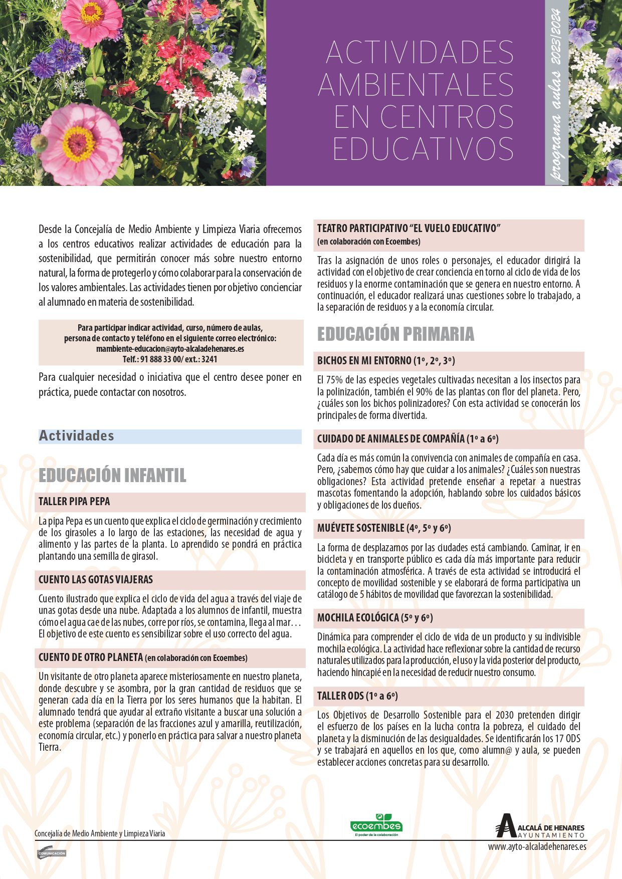 La Concejalía de Medio Ambiente y Limpieza Viaria ofrece a los centros educativos un conjunto de actividades de educación para la sostenibilidad que facilita el conocimiento del valioso entorno natural de Alcalá de Henares, explica cómo protegerlo y promueve el incremento de la sensibilidad de los más pequeños hacia su conservación.