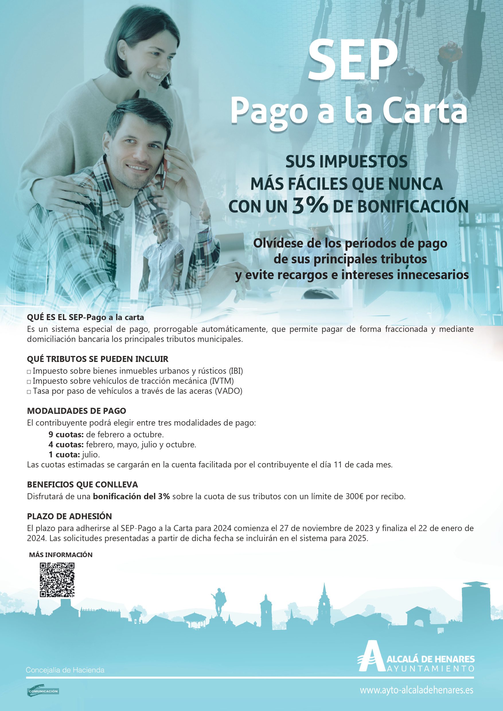 El Ayuntamiento de Alcalá de Henares informa, a través de la Concejalía de Hacienda, de que el lunes, 27 de noviembre, comienza el plazo para acogerse al sistema especial SEP (Sistema Especial de Pago) de Pago a la Carta, que se extenderá hasta el 22 de enero de 2024. Las solicitudes presentadas en dicho plazo surtirán efectos para el ejercicio 2024, y las que se presenten posteriormente, surtirán efectos para el ejercicio 2025.