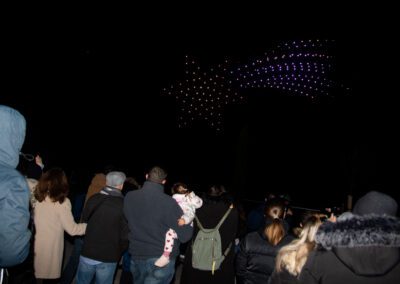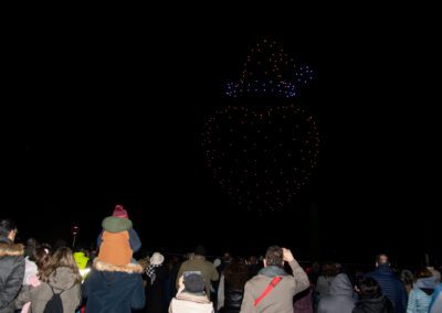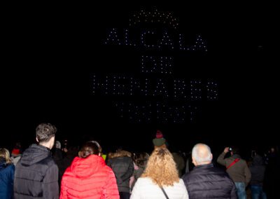 Como broche final tuvo lugar un espectáculo con 220 drones que iluminaron el cielo alcalaíno con diferentes figuras que han podido verse desde el Camino del Juncal, junto a la Ciudad Romana de Complutum. El espectáculo de 220 drones, amenizado con música, proyectó 12 figuras de carácter navideño, como campanas, copos de nieve, una estrella, los reyes magos, un árbol de Navidad, a Papá Noel, un regalo, o un corazón navideño, y también en homenaje a la ciudad como su propio nombre o la Universidad.