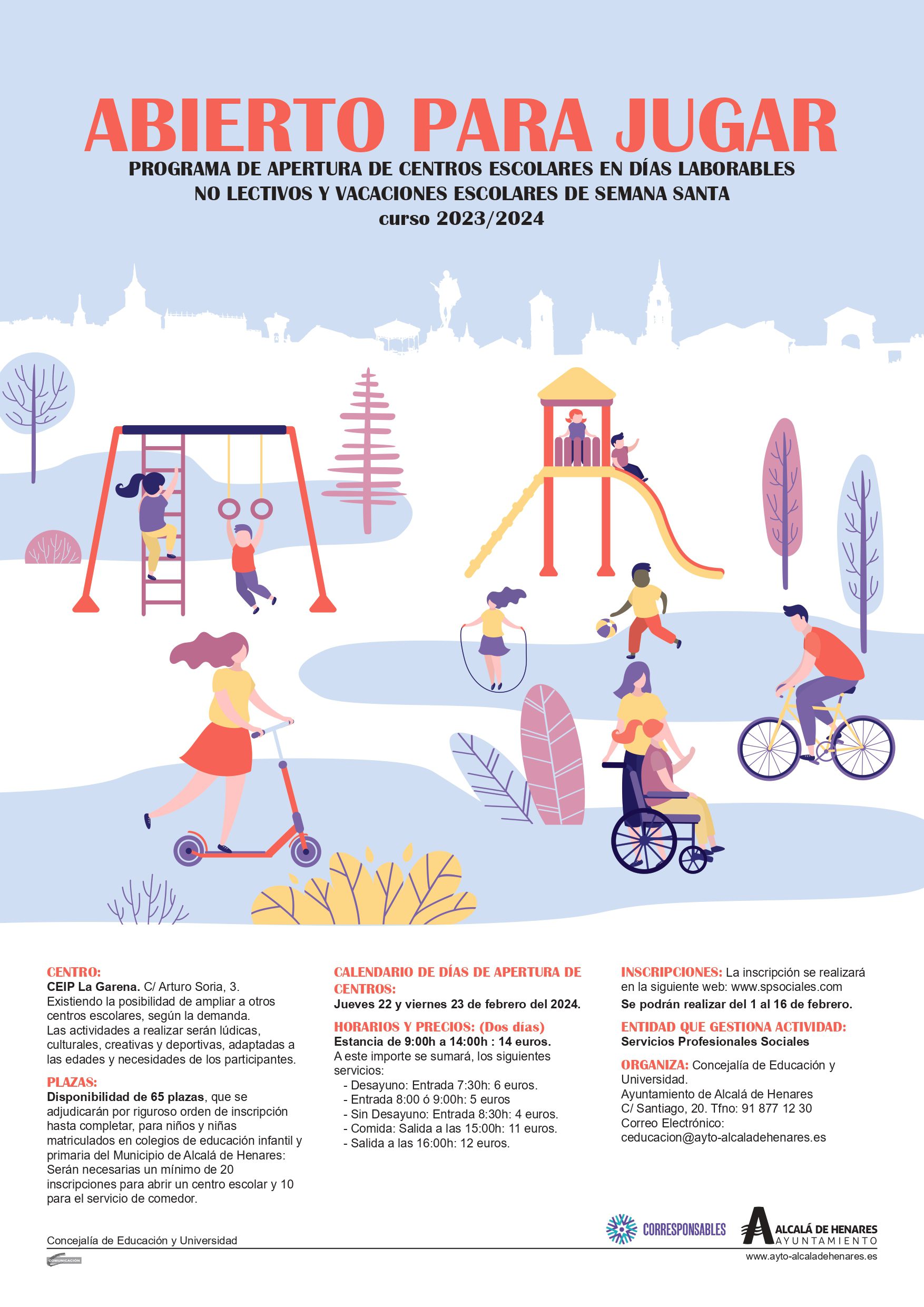 La Concejalía de Educación informa de que los próximos días 22 y 23 de febrero, no lectivos en el calendario escolar, el CEIP La Garena abrirá sus puertas en el marco del programa “Abierto para Jugar”.